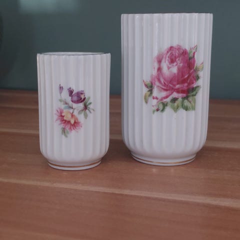 Lyngbyvase med blomsterdekoration. Måler 15 cm. Fin stand. 2. sortering.
