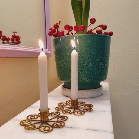 2 stk. små fine lysestager i messing til kertelys/ juletræspynt. Den ene ser mere guld farvet ud og den anden har en svag guldrosa tone, har tænkt på om den ene er forgyldt, men kan ikke se noget mærker der bekræfter det.