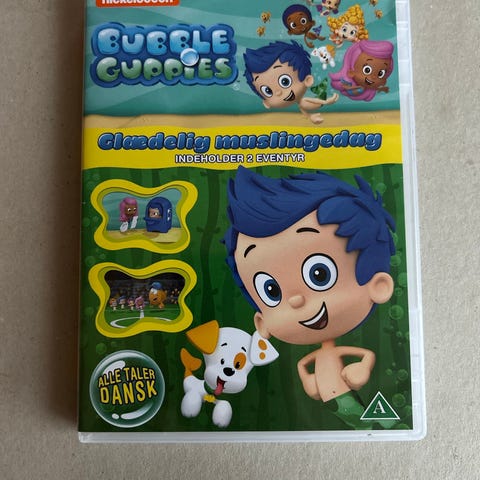 Nickelodeon Bubble Guppies DVD med titlen Glædelig muslingedag. Indeholder episoder med karakterer som Molly, Gil, Goby, Deema, Oona, Nonny og Mr. Grouper. Sprogmuligheder inkluderer dansk tale og undertekster. Egnet til børn og familier.