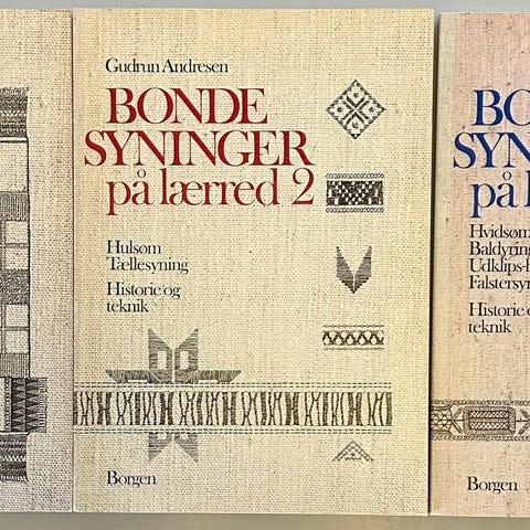 Bøger og blade, Bondesyninger på lærrede 1 ´+ 2, Bondesyninger på lærred dragværk, rudesyning,korssting Historie og teknik samt Bondesyninger på lærred 2 Hulsøm, tællesyning historie og teknik Begge af Gudrun Andresen udsolgt fra forlaget Borgen for længst se billedet samlet pris kr. 795