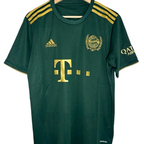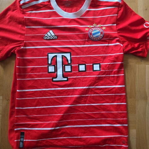 Adidas FC Bayern München fodboldtrøje i rød farve med sort logo og detaljer. Trøjen har Bundesliga- og Allianz-logoer på ærmerne. Den er dekoreret med autografer, hvilket gør den velegnet til samlere eller fans af holdet.