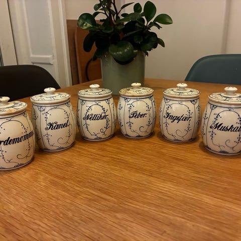 Porcelæn, Krydderikrukke med låg, Vileroy und Boch, Gammel original krukke med påskrift "Nelken". Knop på låg limet. 9,5 cm