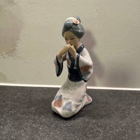 Tysk Porcelæn ballerina figur med detaljer i guld og blomster. Figuren har en kjole med fine blonder og står på en rund base. Mangler et sæt midterfingre, men ellers i meget fin stand. Tylskørtet er lavet af porcelæn.