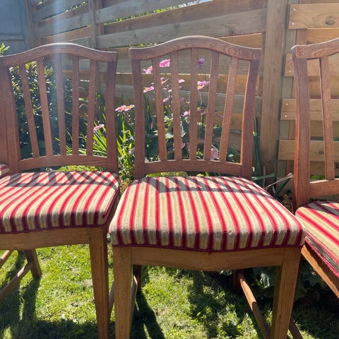 Egetræs spisebord stole med sort betræk. (Med et par pletter, ikke forsøgt fjernet) Meget kraftig kvalitet og tunge.