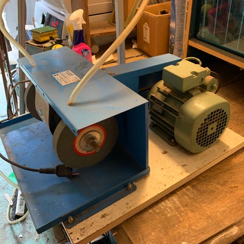 Slibningen sker ved at stenene “rumler” rundt inde i de roterende gummibeholdere sammen med vand og slibepulver. Der kan være ca. 1 kg mindre sten i hver beholder. Der slibes med 4 forskellige finheder af slibepulver og til sidst poleres, også i beholderen. Hele processen tager omkring 4 uger der følger ca.7 kg. slibepulver med så hele maskineriet er klar til brug . søgeord , stenslibning , stensliber , tromlesliber ,