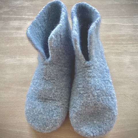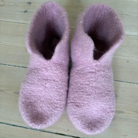 Bløde og varme filt-hjemmesko i mørkeblå. Let brugte og i pæn stand. Komfortable og nemme at tage af og på.