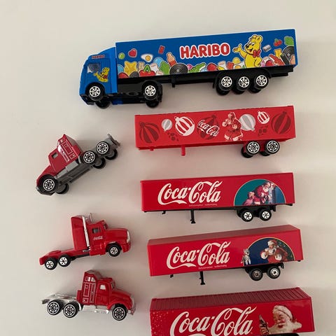 legetøjslastbil sæt bestående af 5lastbiler i rød og gul farve. Modellerne inkluderer forskellige typer lastbiler med 3 stk. lastbiler med Coca-Cola branding. Materialet er plast og metal. Sættet er velegnet til samling eller leg.Bla. matchbox,berliner , budyy.. samlet pris 1000 stk. pris 300,-
