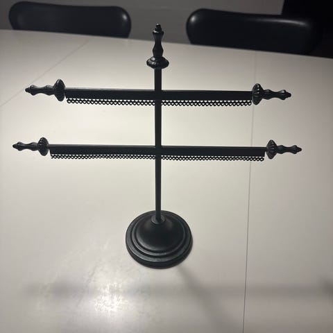 smykkestativ i sort metal med flere kroge og hylder til opbevaring af smykker. Designet til at holde forskellige typer smykker organiseret og let tilgængelige.