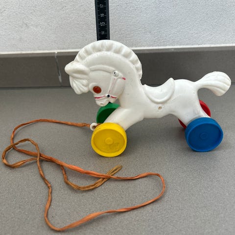 Gammel legetøjs hest, synlige spor. Der plejede at være en kæde, men blev skiftet til en blød snor for at passe på børnefingrene.