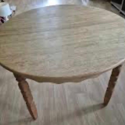 Flot rund egetræsbord med 5 pæne egetræsstole med sort læder, er ikke brugt mange gange.