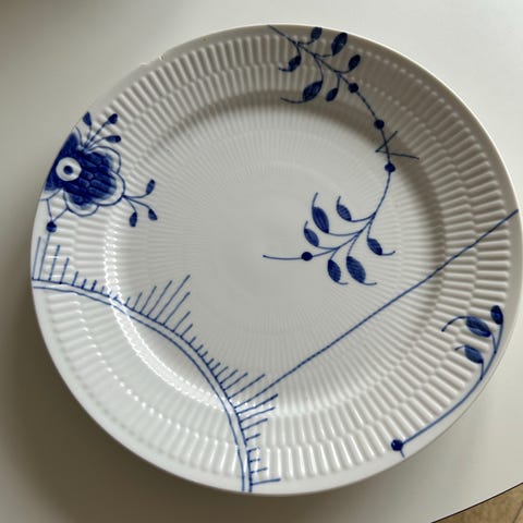 Royal Copenhagen tallerken med karakteristisk blå blomstermønster. Tallerkenen er hvid med blå dekorative elementer og har en oval form. Den er lavet af porcelæn og egnet til servering af mad.