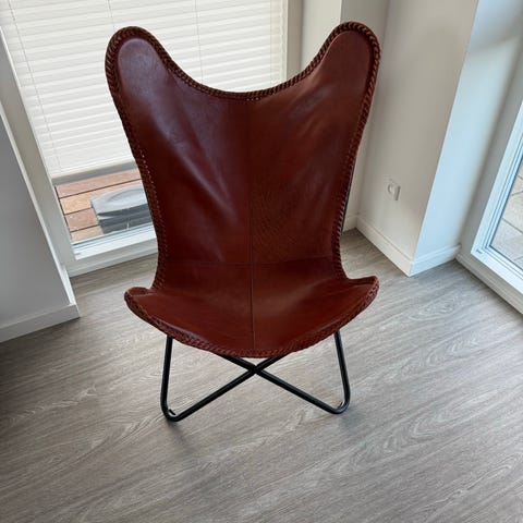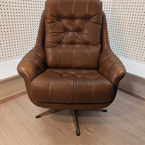 Lænestol med polstret sæde og ryg i læder. Stolens ramme er lavet af træ. Designet til at give komfort med en lang, sammenhængende sidde- og ryglæns overflade. Farven på læderet er rødbrun, og trærammen har en naturlig træfinish.