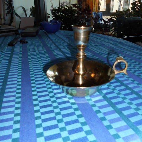 Messing lysestage ca. 15,5 cm høj, 40 kr.