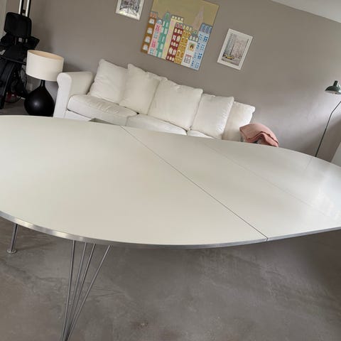 Piet Hein. Superellipse spisebord med hvidlaminat plade, monteret med spændben af forkromet stål, H. 70 L. 180 B. 120cm. Fremstillet hos Fritz Hansen.