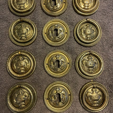 8 vintage messingbeslag, skuffegreb i Empire stil med et dekorativt motiv, herunder et kar med håndtag og en snoet kant. Stilen var fremherskende ml. ca. 1810 - 1840.