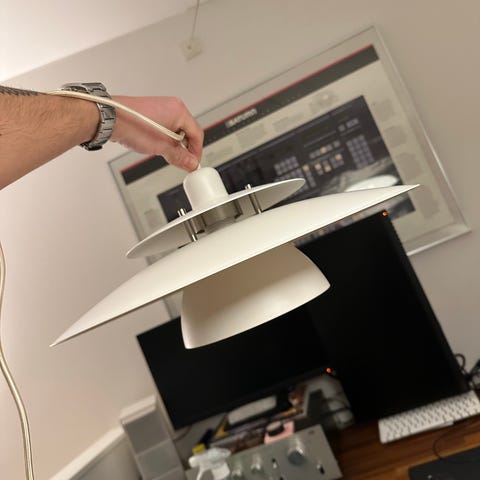 Fremstår i god stand ca 40 cm i diameter og va 47 cm høj hænger i wire og sort stof ledning