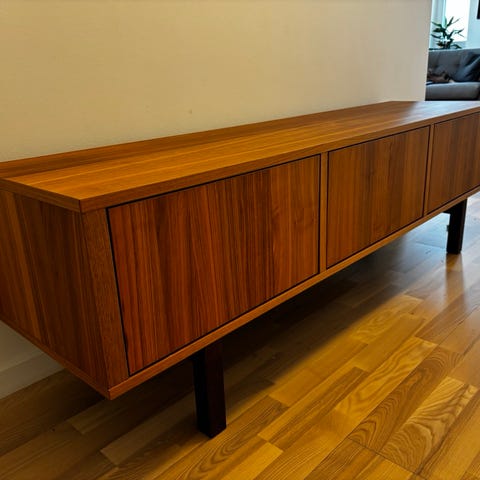 1. TV Table. Plenty of storage, minor scratches. Dimensions: 160 × 43 × 52 cm. Price: 200 kr.