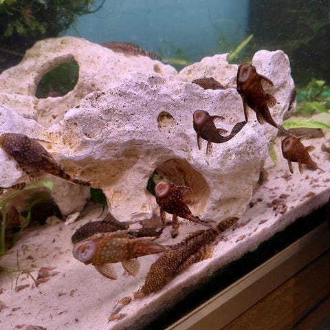 Pleco fisk, kendt for at hjælpe med algebekæmpelse i akvarier. Fiskens størrelse og farve kan variere, men den er typisk mørk med karakteristiske mønstre. Velegnet til ferskvandsakvarier.