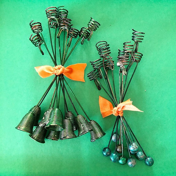 Messingkræmmerhuse, der både kan bruges som stiliserede grantræer og omvendt som vaser i en dekoration. Højde 20 og 30 cm. Pris pr stk 25kr.