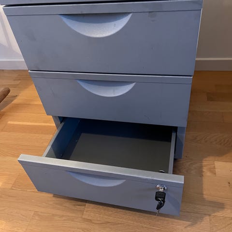 Lille hvid kommode I trådmetal. Mener det er en ikea. Den har to små hjul på bagerste 'ben'. Der er lidt misfarvning øverst som muligvis kan skrubbes af.