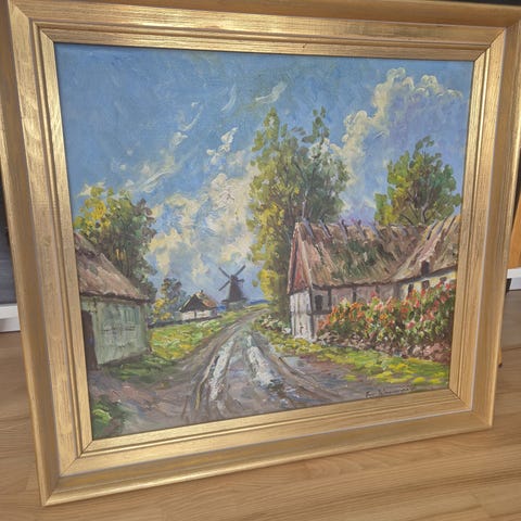 Maleri af byscene med mennesker mm malet af Finn wennerwald
