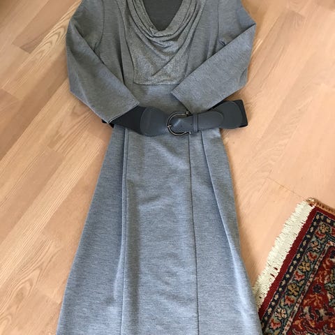 Hverdagskjole i grå farve, størrelse M, lavet af bomuld. Kjolen har hætte og lange ærmer, designet til kvinder. Materialet sikrer komfort og egner sig til hverdagsbrug.
