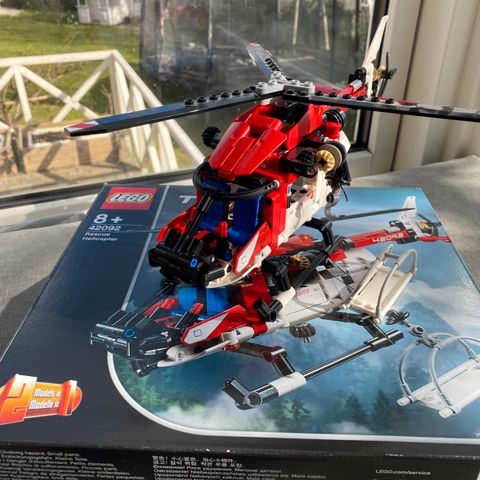 LEGO Technic 42092 helikopter i rød og hvid. Modellen er detaljeret med roterende rotorer og cockpit. Byggesæt i plastmateriale, egnet til samling og leg.