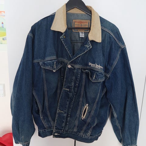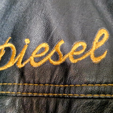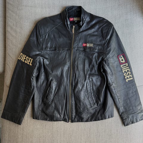 Vintage Diesel jakke i brun læder til mænd i størrelse 48. Dvs en medium. Jakken har lynlåslommer og detaljer i quiltet læder på skuldre og ærmer. Der ses brugsspor og slid på materialet, herunder en revne på ærmet der evt. kan patches. Jakken er egnet til udendørs brug som en del af en casual garderobe.