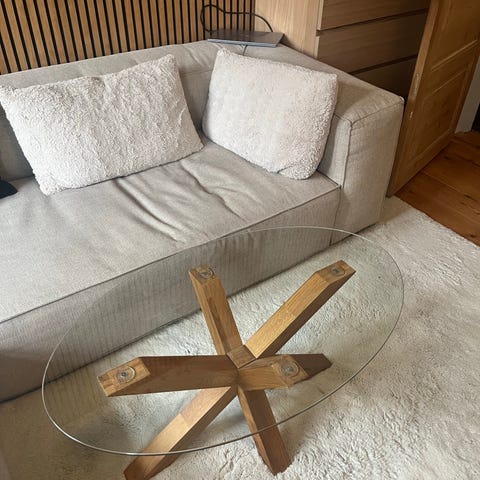 Bordet er solidt bygget og fremstår let i rummet takket være glaspladen, mens egetræet tilfører varme og kvalitet.