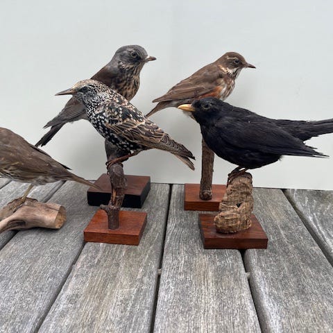 Mange forskellige udstoppede småfugle.