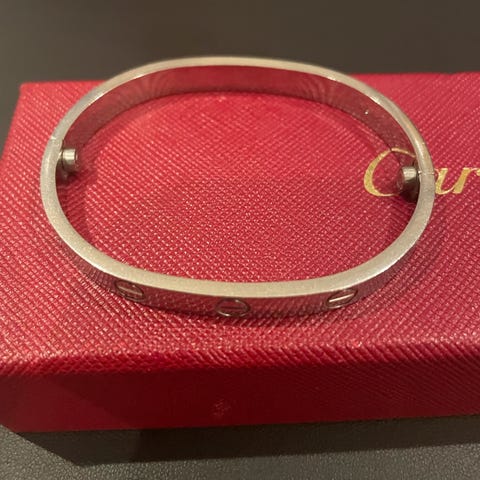 Cartier Love bracelet, classic model, armbånd til kvinde fremstillet i hvidguld med 10 indlagte diamanter. Armbåndet leveres med original opbevaringsæske og et værktøj til åbning og lukning. Str. 18cm. Kvittering haves. Nypris kr. 156.000. Prisen er ikke til forhandling.