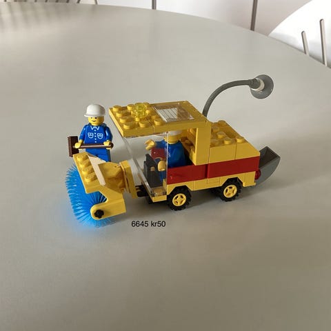 LEGO City lastbil med fejemaskine. Modellen inkluderer en blå lastbil med fejemaskine foran samt en anhænger med en gul gravemaskine. Sættet er designet til børn og er en del af LEGO City-serien.