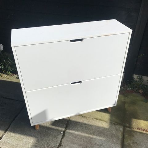 Opbevaringsskab/skoskab med to låger i hvid farve. Skabet står på ben og har et enkelt design. Velegnet til opbevaring i forskellige rum.