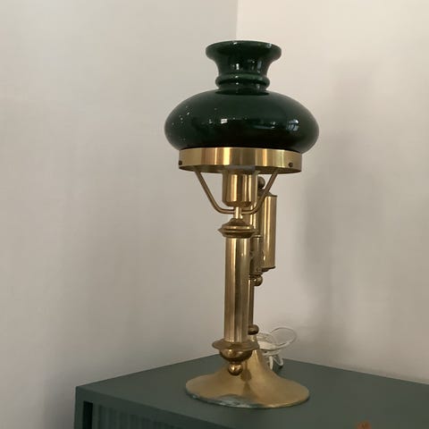 Fin lampe i messing og grå/grøn skærm