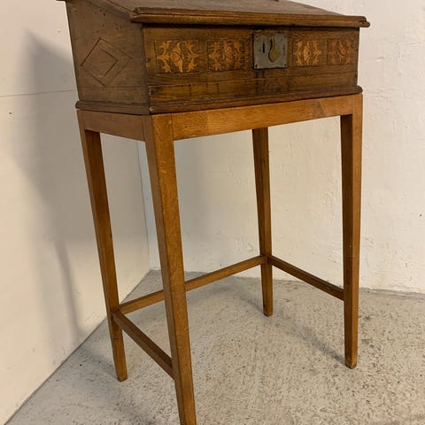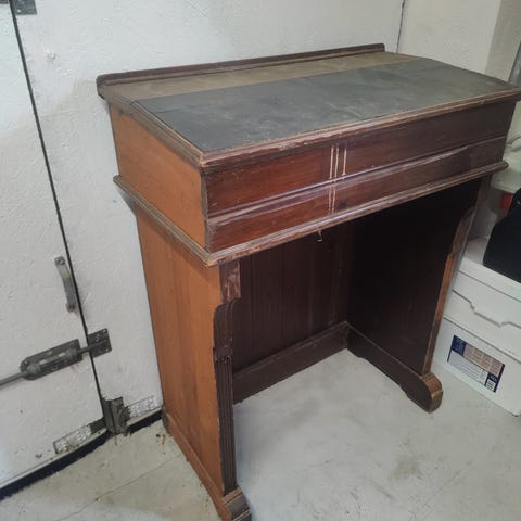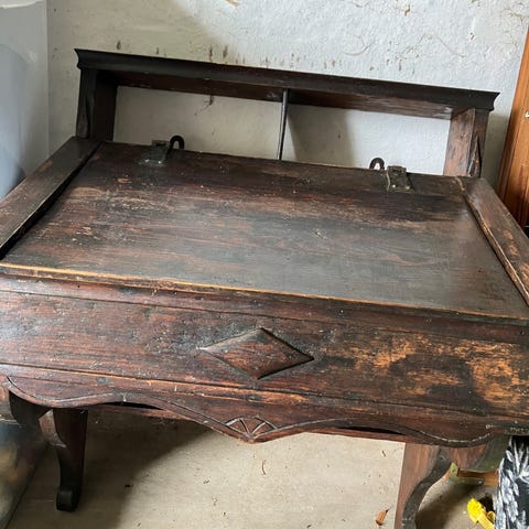 Skrivepult, Gammelt stå skrivepult,har stået hos en købmand Larsen Marielyst ude i hendes baglokale,hvor der var koks-sliske ,så den har været sort på et tidspunkt,men redet af min mor en gang start halvfjerdserne.Den er i fyrretræ.
