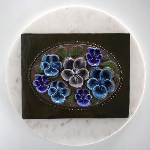 Lille keramik relief / vægplade / vægdekoration fra Jie Gantofta Sweden. Motivet forestiller lyseblå blomster med grøn ramme. Glaseret. Tre afslag på bagsiden.