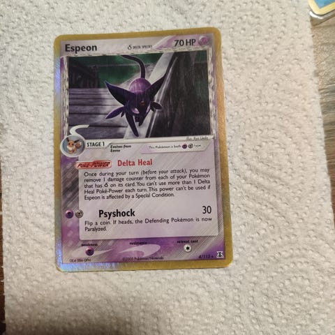 Kortet har farverige detaljer og viser Espeon med forskellige angreb og evner.