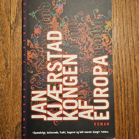 Jan Kjærstad Kongen af Europa er en roman. Bogen indeholder tekst på dansk og har en farverig og detaljeret forside med grafiske elementer.
