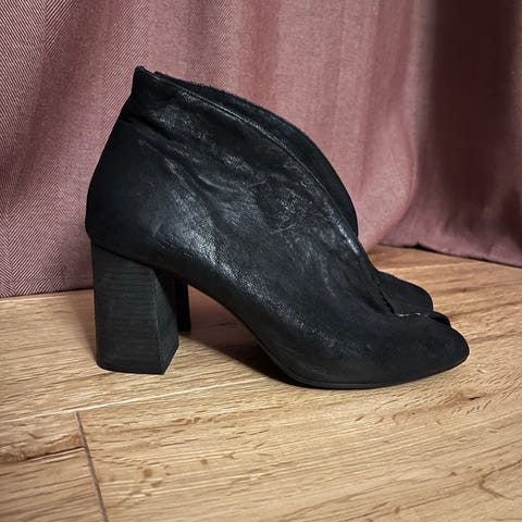 Meget flot og stilren sko i sort skind. Hæl måler 8cm bagpå. Der er 1cm plateau foran. Sælges, da jeg ikke mere kan gå med høje hæle.