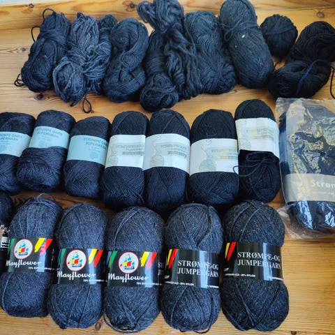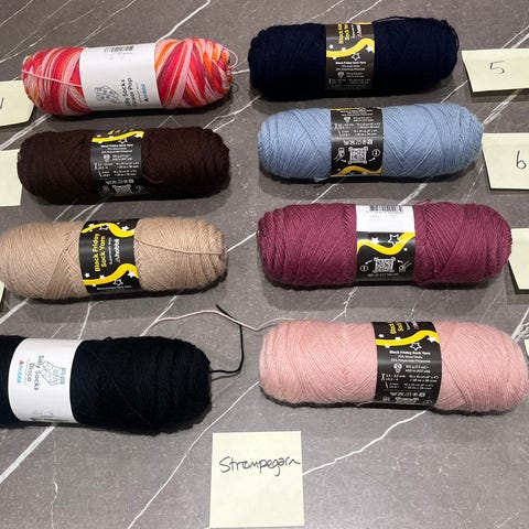 Strømpegarn i forskellige fabrikater. Det meste med løbelængde omkring 200 – 210 meter/50 gram. Uldindholdet er mellem 70 – 80%, på nær den turkis/hvide rest, det er mest akryl. Der er i alt 540 gram garn. Der medfølger 8 opskrifter som mest er udskrifter fra forskellige garnsider.