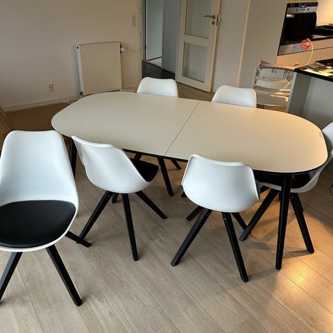 Velholdt spisebordssæt inkl. to stk. tillægsplader på hver 50 cm. Bordet kan således slås ud til 285 cm.