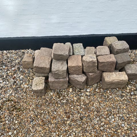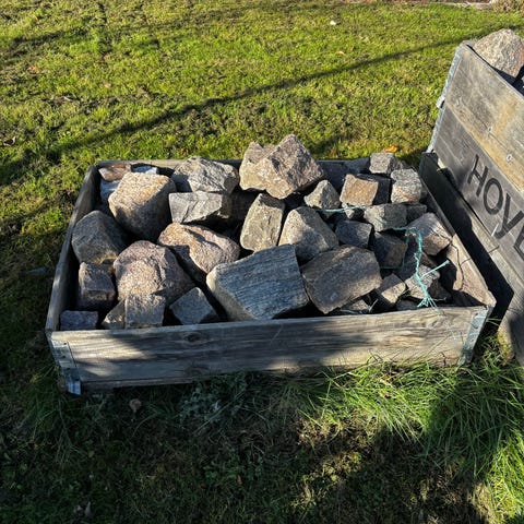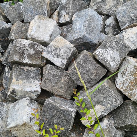 Hver sten er massiv og velegnet til brug i haveanlæg, belægning eller som dekorative elementer. Farven er naturlig grå, og stenene har en robust og holdbar struktur.
