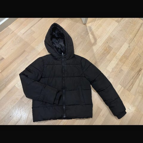 Lækker dunjakke i sort skindende look og sølv i inderkanten.