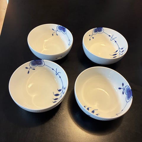 Royal Copenhagen Musselmalet Riflet skål i porcelæn med klassisk blå blomsterdekoration. Skålen har et tidløst design og er en del af Royal Copenhagens Musselmalet Riflet serie.