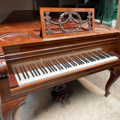Miniature klaver i træ formet som et flygel med et musikalsk motiv og detaljer som tangenter og noder.