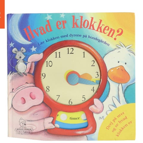Klumme børnebog med titlen 'Hvad er klokken?'. Bogen er designet til at hjælpe børn med at lære at aflæse tiden med ur. Indeholder illustrationer og en urskive til interaktiv læring.