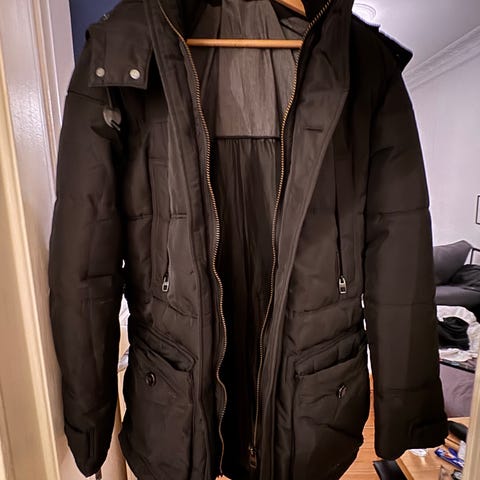 Zara Vinterjakke til mænd i størrelse M. Jakken er sort og lavet af polyester, designet til udendørs brug i vintermånederne.