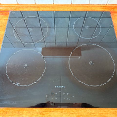 Siemens induktion kogeplade med fire kogezoner. Overfladen er sort glas, der kræver forsigtig håndtering for at undgå skader. Velegnet til brug i køkkener med induktionskomfurer.