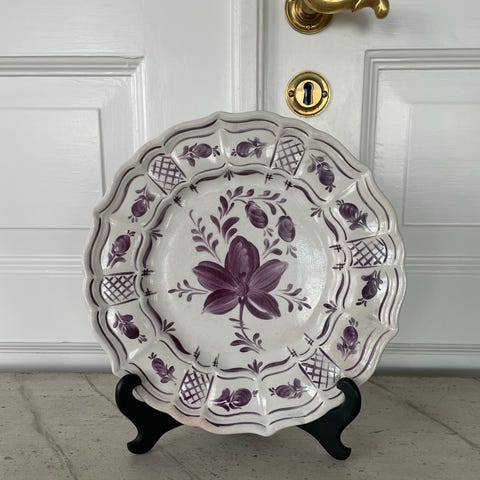 Smuk håndmalet keramik tallerken / fad / vægtallerken, som er oplagt at hænge på væggen. Malet og signeret af Birthe Hattel i 1977. Ø: 29 cm.