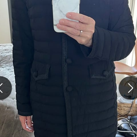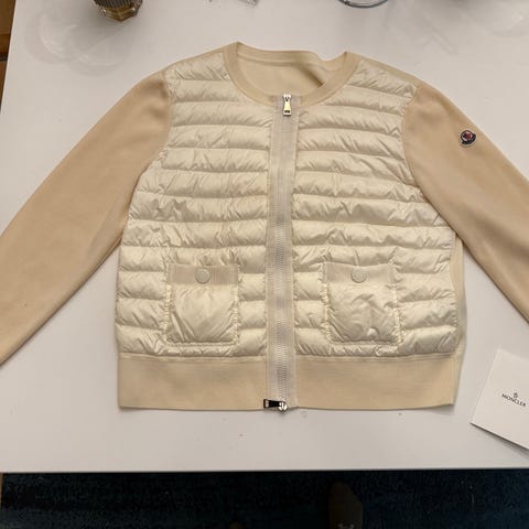 Moncler Andre jakker i sort farve til kvinder, størrelse L. Jakken er lavet af dun, hvilket giver varme og komfort. Designet kombinerer quiltet dunmateriale med strikkede ærmer, hvilket giver en funktionel og stilren jakke til køligere vejr.